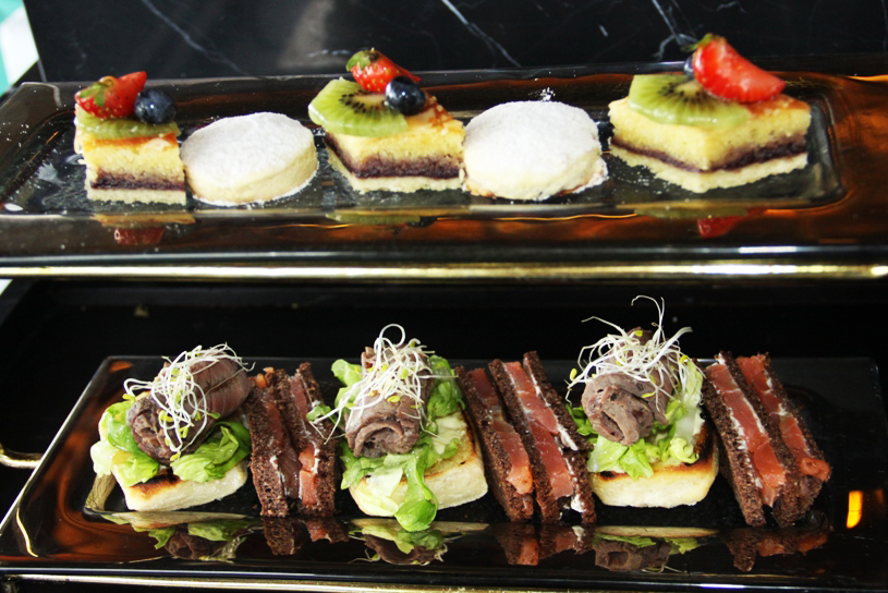 有歐式黑麵包佐煙鮭魚、藍莓司康烤餅、玉米片餅乾…等,